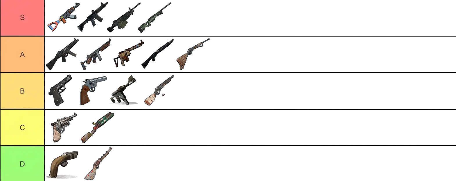 S Tier dominates but demands skill. A Tier offers the best balance of power and ease of use. B Tier is reliable and consistent. C and D Tier are forced options for early wipe or low-resource situations.