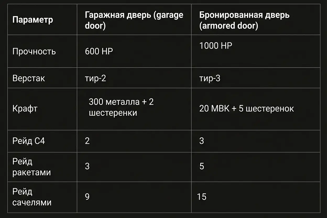 Под конец, отвечая на вопрос “что лучше?”, то для 90% баз ответ будет такой: гаражка для сохранения пространства и удобства в лутовой, а МВК дверь во всех других местах. Гаражная дверь выигрывает по цене и доступности, а бронированная дверь - по максимальной стойкости. Я бы не делал их конкурентами, а использовал их как связку, если ресурсы позволяют.