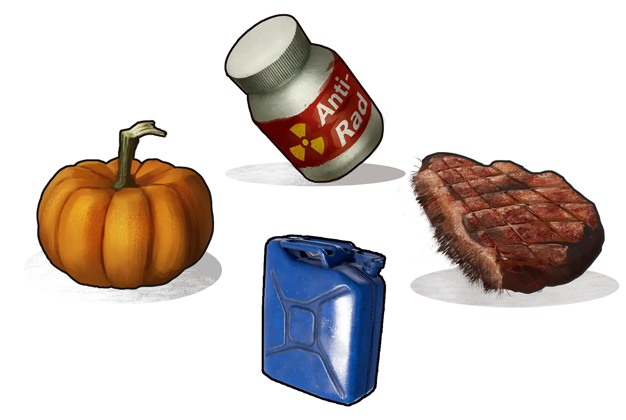 Еда тоже играет роль. Некоторые продукты помогают быстрее восстановить здоровье после облучения, хотя напрямую радиацию они не убирают, а вот вода снижает радиацию, но не сильно. Медикаменты вроде бинтов и шприцов нужны для компенсации урона, если защита оказалась недостаточной.